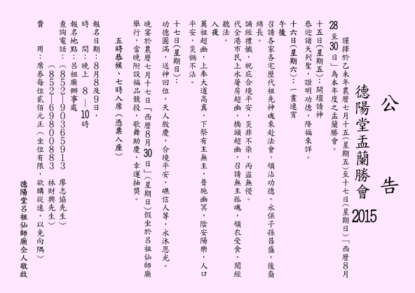 2015乙未年盂蘭勝會定於農曆七月十五日至七月十七日(三天),西曆8月28-30日,節目詳情於本月下旬公報。