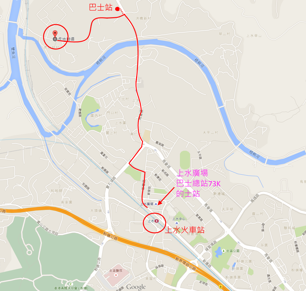 巴士:73K 在上水總站上車,在(虎地㘭站)落車, 再步行約 8-10 分鐘到達。